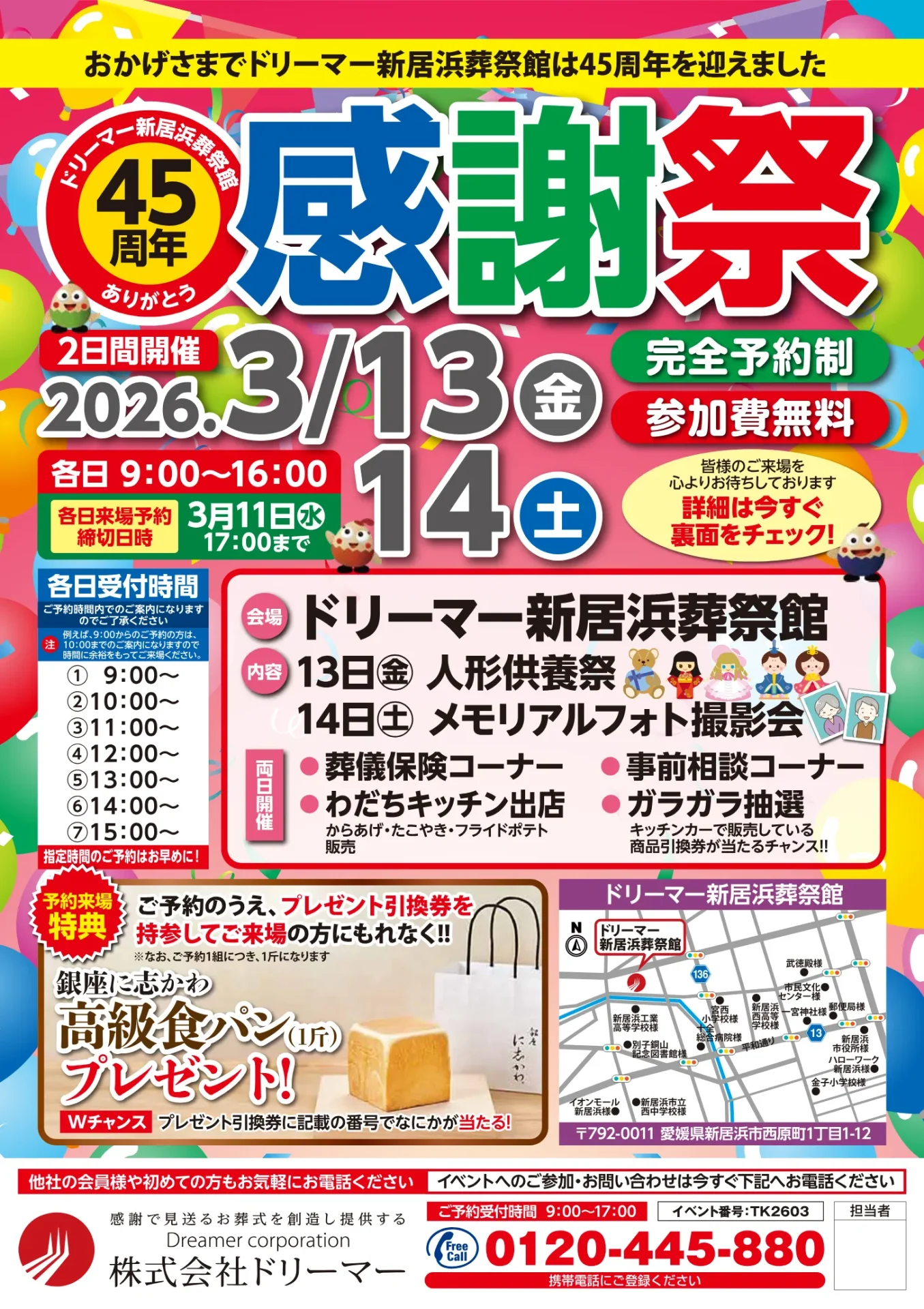 2026年3月13日(金)、3月14日(土)に、ドリーマー新居浜葬祭館にて45周年感謝祭を開催します。