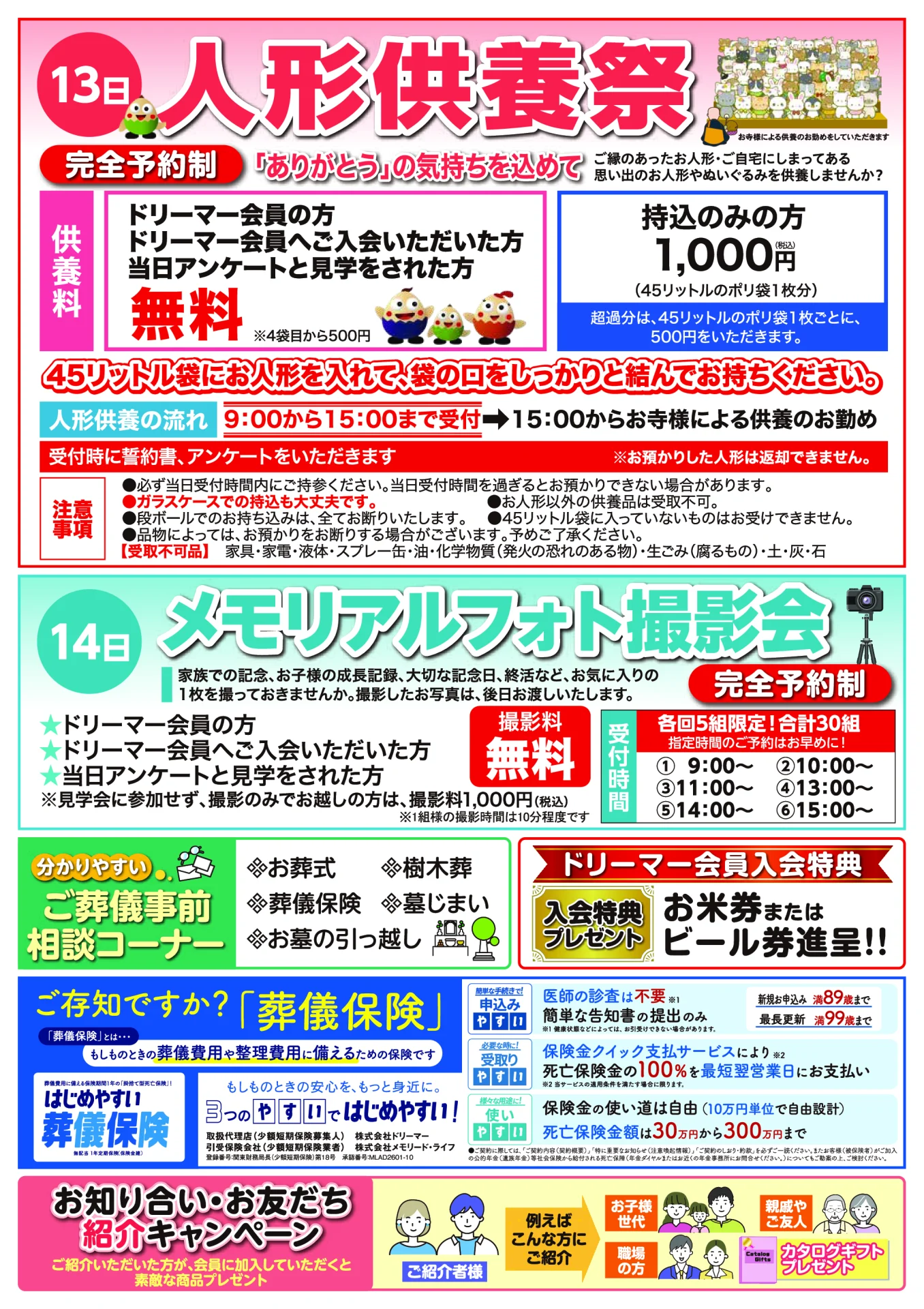 人形供養祭やメモリアルフォト撮影会等のイベントを行いますので、皆様お誘いあわせのうえぜひご来場ください。