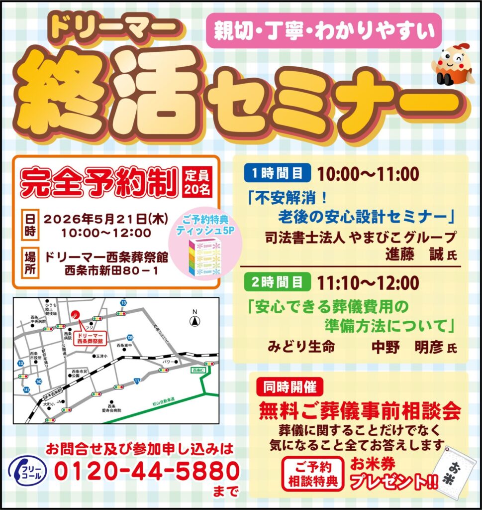 2026年5月21日(木)に、ドリーマー西条葬祭館にて終活セミナーを開催します。