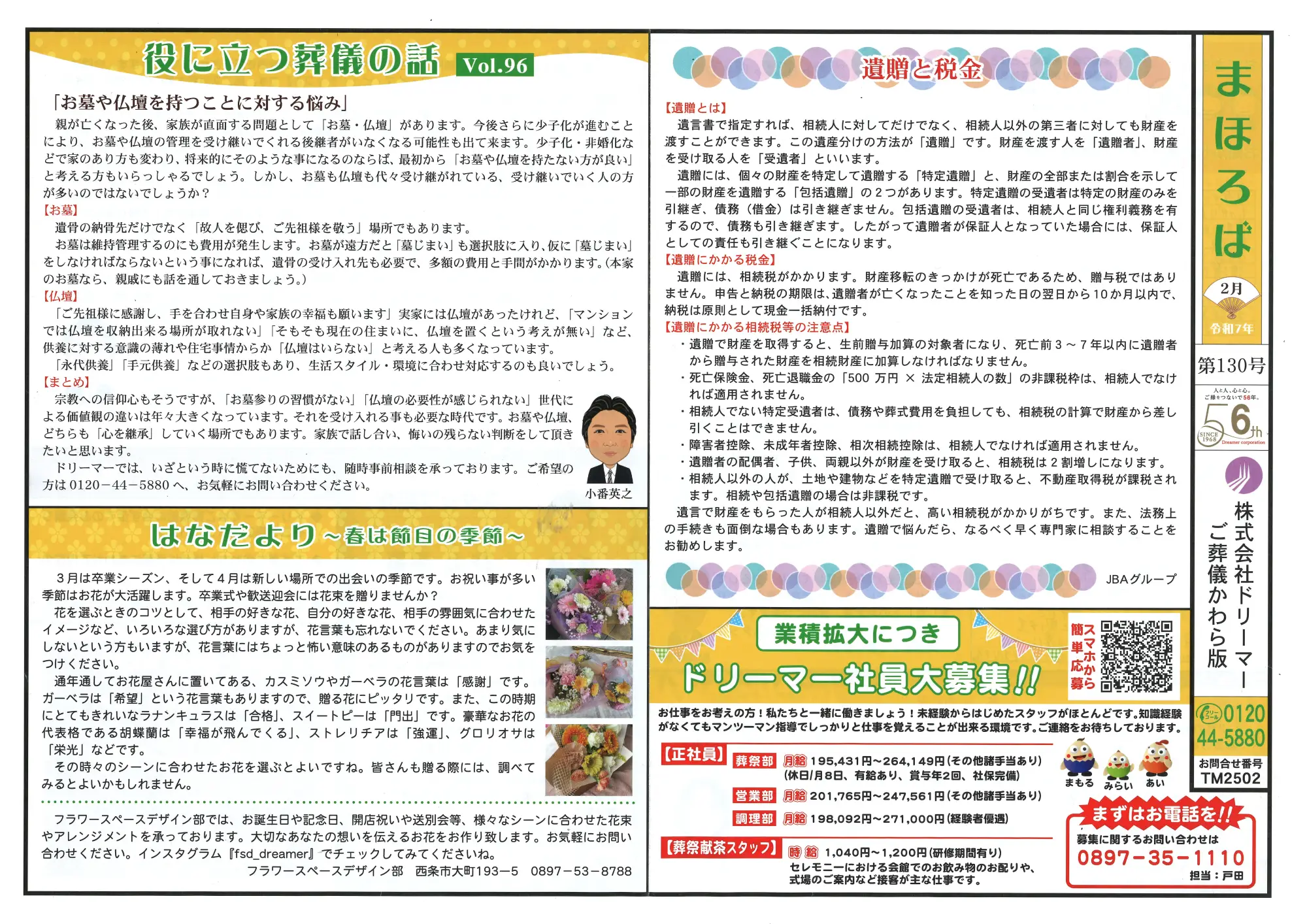 【葬儀かわら版】第130号を発行しました 葬儀かわら版第130号を発行しました。 新居浜市・西条市を中心にお葬儀や法要の知っておくと為になる豆知識や、葬祭スタッフの近況など色々な情報を掲載しておりますので是非ご覧ください。 前の記事へ 次の記事へ